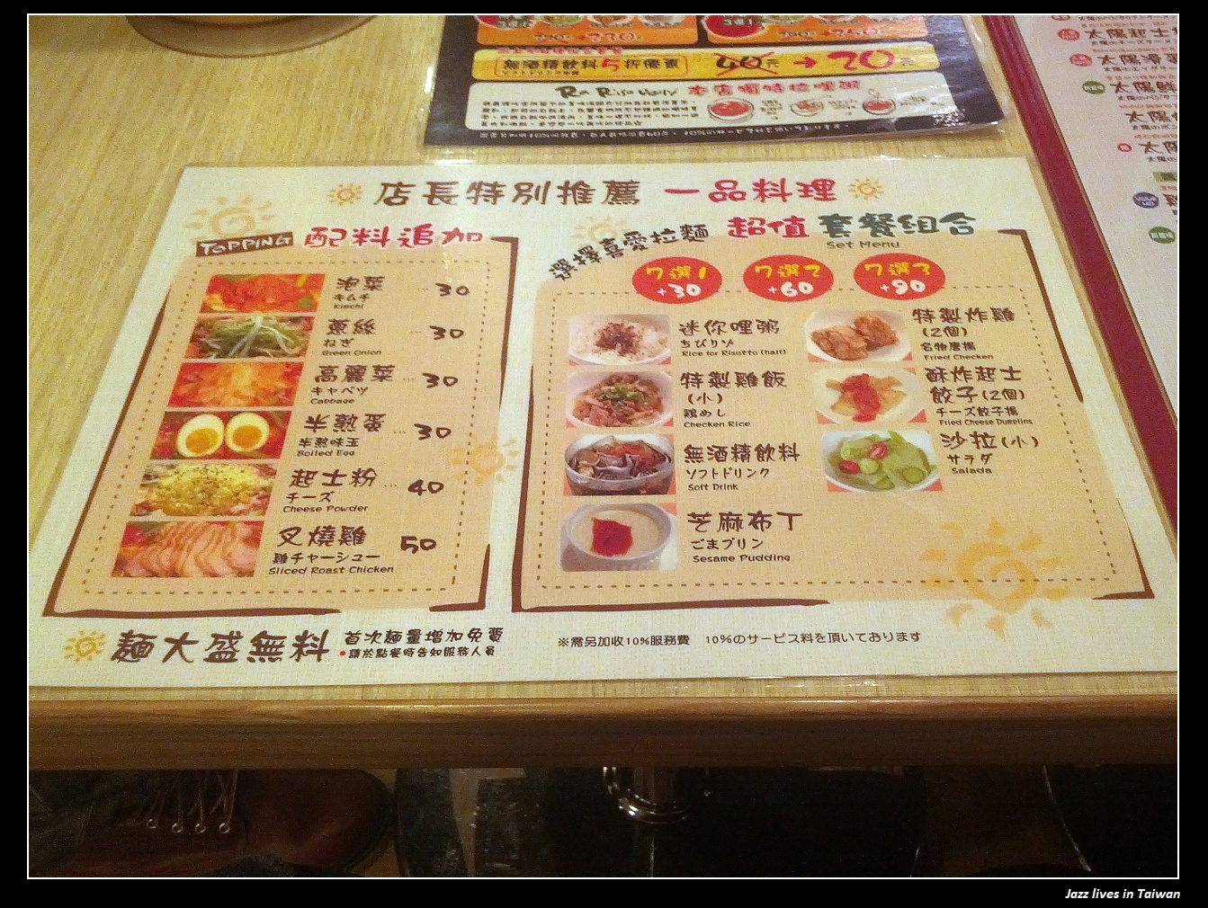 餐桌上放了許多折價的方式, 有"配料追加"與"超值"套餐組合, 客官就自己參考下圖吧!