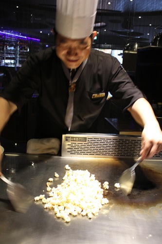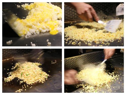 在這裡有六個煎區,每一區都有如包廂般的座位,這天,除了我和湯尼外,另外還有四位大哥大姐在同一包廂,大家同個包廂即是有緣,沒想到也聊開了,這天,因為同桌的前輩們進門時,不小心踉傖了一下,主廚為了展現誠意,不僅招待醋飲,還要上演黃金炒飯秀,非常難得啊!!
