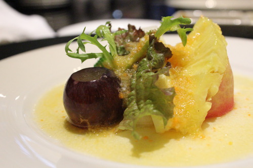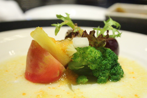 首先登場的是翠玉蔬果沙拉,法式酸醬的口感,酸甜酸甜,有些碎末狀的口感,搭著擺盤的宛如藝術品的蔬果上,味道很鮮。