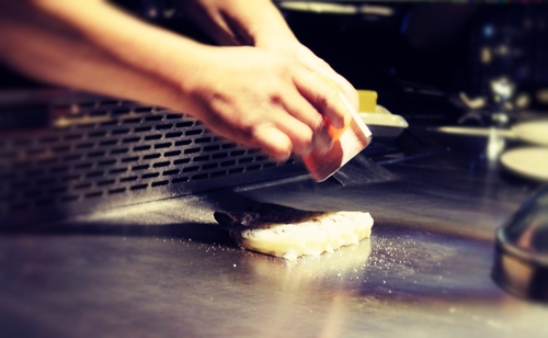 在桌邊等待,聞著香味,心情也充滿了期待,相當愉悅,而後面才開始在煎台上現身的大蝦,可以先上桌耶!!在旁邊等待時,看料理長拿出玫瑰鹽在研磨,提味,真是讓人期待啊!!