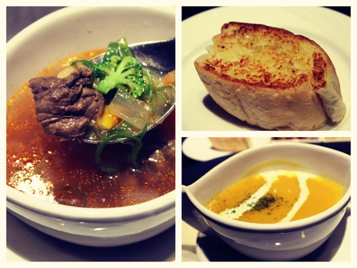 湯品有牛肉蔬菜湯與南瓜濃湯可選擇,牛肉湯清爽的口感,再加上牛肉濃郁的感覺,很享受。而南瓜湯最適合搭配特製的麵包,麵包吃起來也很不同噢。麵包除了搭配濃湯外,也可以與兩種不同的小菜搭配,吃起來又是另一種滋味。麵包不怕不夠,還可以追加。