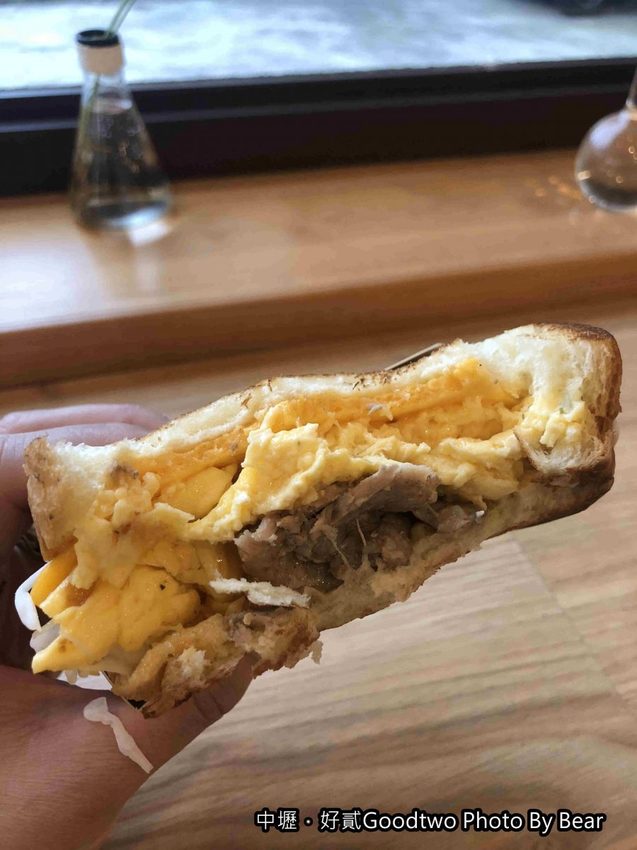 好貳肉蛋,內餡夾有手工豬排肉、歐姆蛋和起司,並加了不少美乃滋