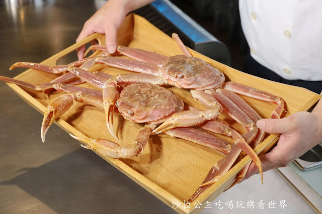 端上桌的松葉蟹還是活體的,讓我們看完拍照後才端進去處理