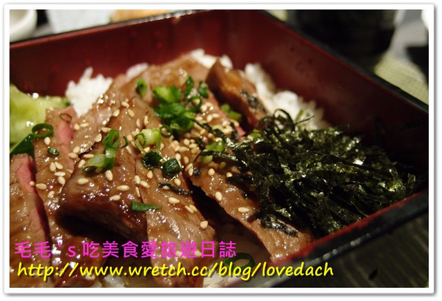 粉嫩的七分熟牛小排,芝麻與蔥末的點綴,切成細絲的海苔盤踞在一角