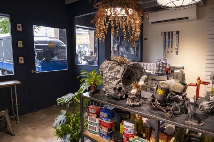將維修器具和零件、商品結合植物和咖啡廳的元素,充滿了反差卻又無違和,讓人耳目一新,新鮮感滿點!