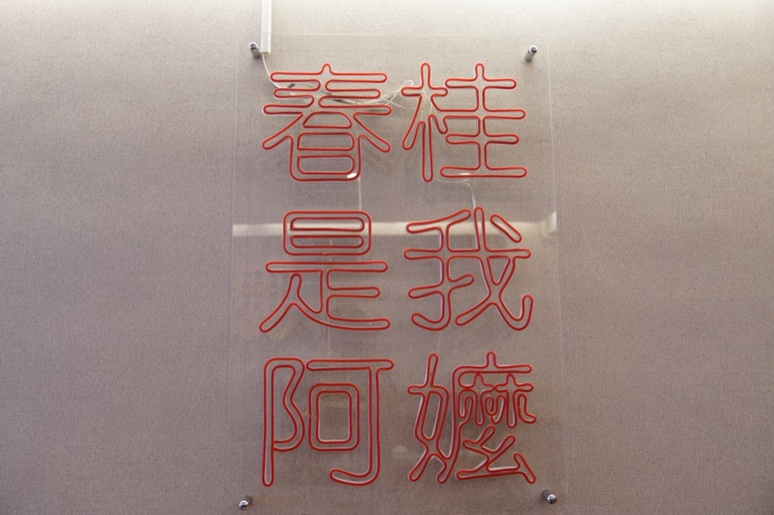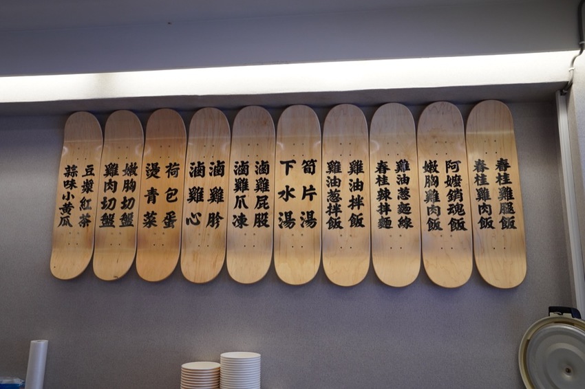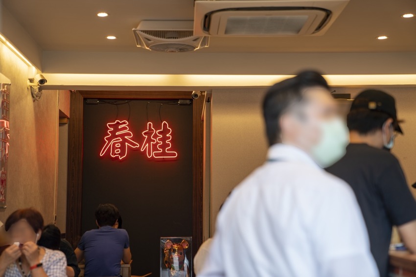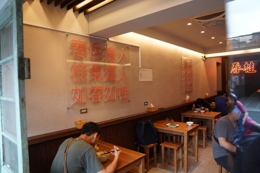 雖然販售著古早味雞肉飯,但有別以往小吃店風貌,紅磚、舊式拉門等復古元素混搭成另類台式風味,讓人耳目一新,尤其牆上掛著亮紅色霓虹燈招牌新穎標語「春桂是我阿嬤」「春氣撩人…」,十分有創意,等待用餐同時絕對不無聊!