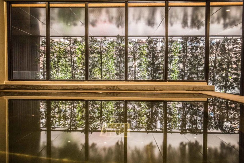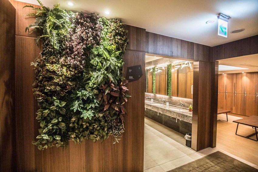 男湯設計風格完全不一樣,一大面植生牆裝飾在入口處與洗手台鏡面間,讓在室內的溫泉池也不失自然的氛圍,裝潢風格也是走木製的日式和風,猶如置身日本超頂級溫泉飯店一般