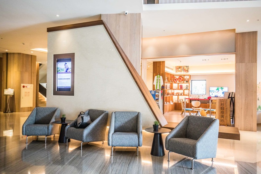 走進礁溪山形閣溫泉飯店,印入眼簾的是氣派豪華的挑高大廳,山形閣是以當地獨特的風俗文化為靈感,外觀設計採用原住民生活的山嶽地形及雄偉垂直的峭壁為主題,所以是大廳內的線條很多是以山的形狀為設計概念