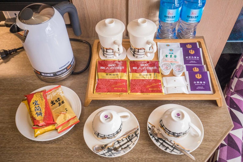 備品茶包咖啡,茶杯是版畫名師林耀堂為山形閣特別設計燒製,超漂亮,另外還提供迎賓甜點,來到宜蘭當然是要宜蘭餅囉!
