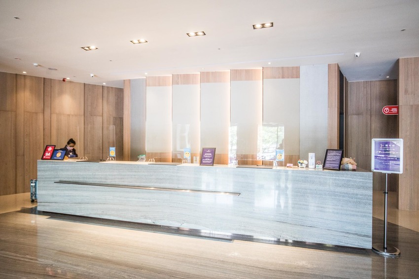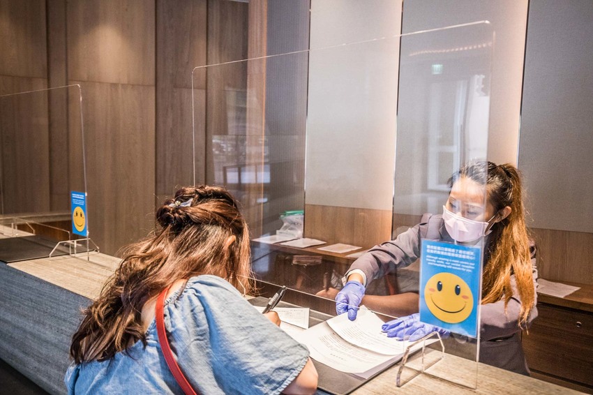 山形閣的櫃台,因應目前疫情的關係,山形閣溫泉飯店確實落實防疫政策,櫃檯設置了透明隔板,量體溫酒精消毒也是確實執行,同時入住時也會讓房客簽署『健康聲明調查表』
