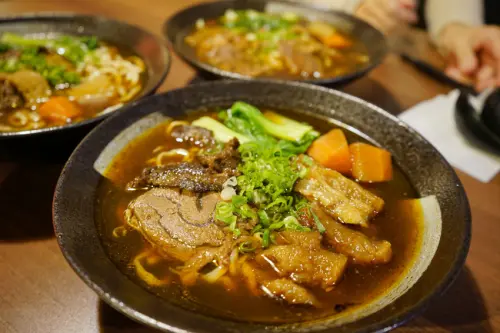 位於南京復興站的神仙牛肉麵,曾獲得台北牛肉麵節盲測雙料冠軍,也與日本丸大公司合作在日本販售限量牛肉麵泡麵,神仙牛肉麵主要特色就是以辣而不油的川味湯頭與溫醇甘甜的清燉湯頭取勝,我個人還蠻喜歡神仙牛肉麵清燉湯頭的甘甜,如果是肉食派的朋友,我會推薦神仙牛肉麵天官四福麵,整個給你滿滿的牛腱、牛肚、牛筋跟牛肋條,吃起來真的很爽。