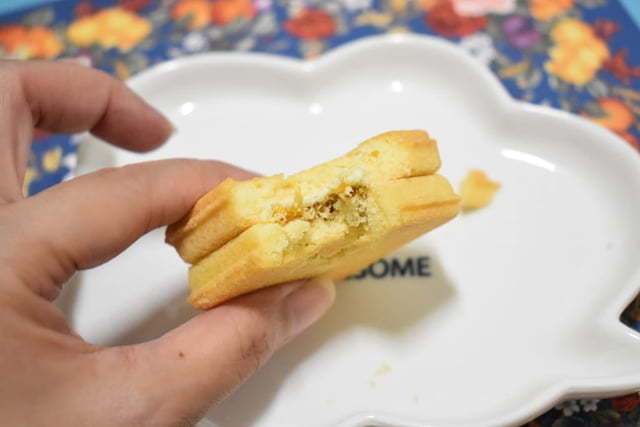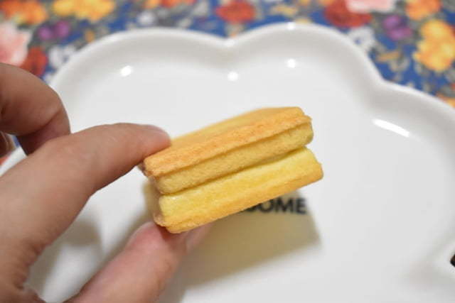 ●從側面看起來,一點也不起眼,就是塊夾心餅乾的感覺,而且完全看不到內餡,不知道裡面藏著什麼小秘密,吃起來的味道怎麼樣呢?