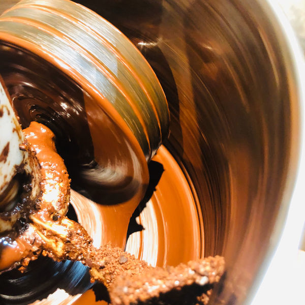巧克力在研磨過後,因為可可油脂的關係,會慢慢的變成液態狀,老闆說可可豆裡面富含48%-53%的可可脂,研磨過程會呈現膏狀,稱可可膏,也因此巧克力有一個特性,遇熱會融化遇冷會凝結。