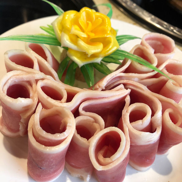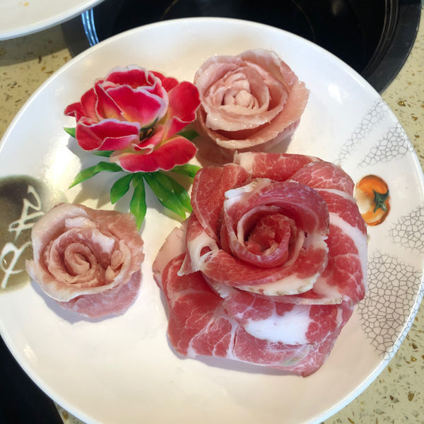豬肉有松阪豬,梅花豬,嫩切霜降豬,排成花的形狀,不禁讓人會心一笑