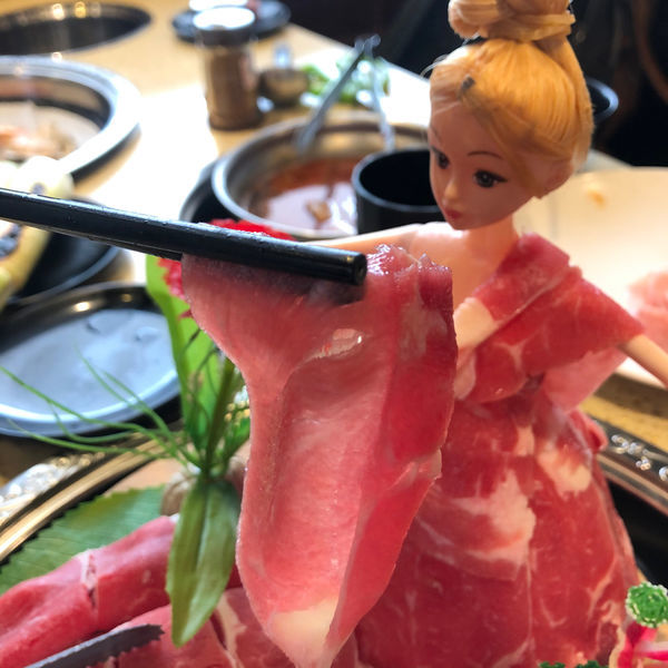 店家會把我們點的肉披在娃娃身上,這芭比娃娃盤上分別有雪花牛,牛肋條