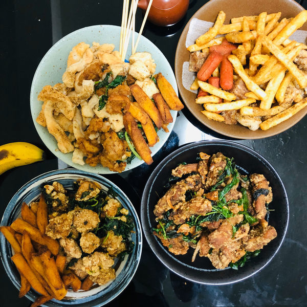 梅粉薯條 與 鹹酥雞,鹹酥雞經過脫油,更清爽不油膩,九層塔非常酥脆不吸油。