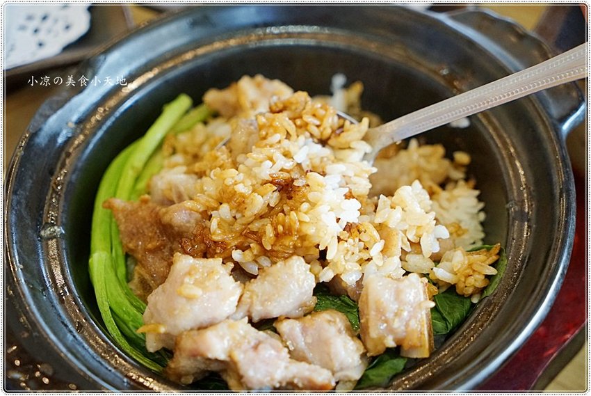 煲仔飯搭上油菜、並淋入特製醬汁上桌,在拌勻時散發起濃郁的香氣,喜歡吃鍋巴的可以讓米飯在鍋內停留久一點再拌勻唷! 油菜清脆爽口搭上排骨柔嫩的獨特風味、鹹香的米飯,賀呷尬涮嘴,尤其是那鍋巴的香氣更讚!!