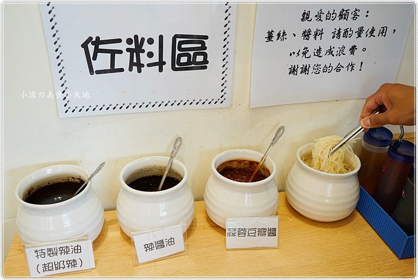 佐料區,提供特製辣油、辣醬油、蒜蓉豆瓣醬以及薑絲,請斟酌拿取!