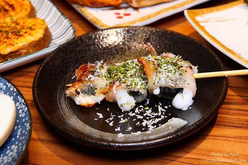 這個看起來很浮誇的,就是豬五花麻糬捲,麻糬烤完軟嫩嫩的,豬五花上面還撒了好多香料,吃起來有麻糬的甜味和肉片的鹹味,吃了很涮嘴啦!