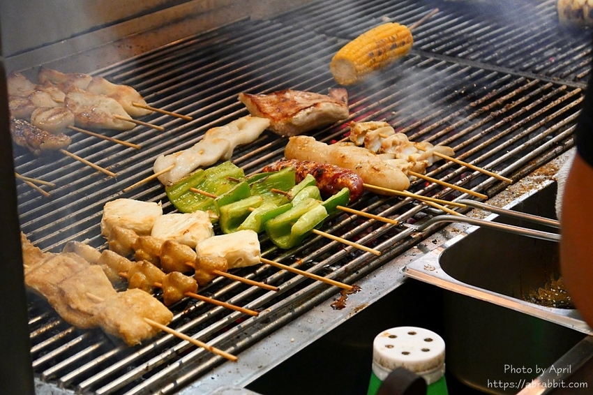點完之後工作人員隨即就會著手幫忙烤了,一整排食材在爐子上頭烤,店家用的是龍眼木直火來燒烤食材,抽風設備都非常完善,一點都沒有燒烤臭臭的煙味。