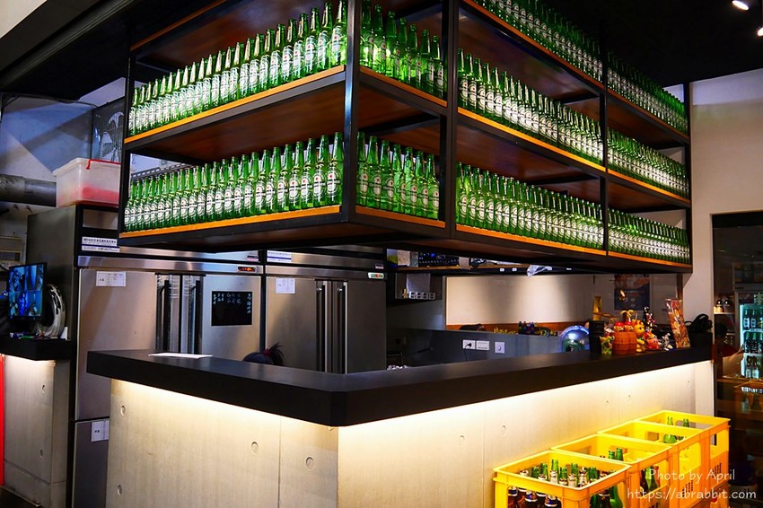 再走進去一點的吧台處,滿滿的綠色海尼根瓶子排成一排看起來好壯觀,也特別亮眼。