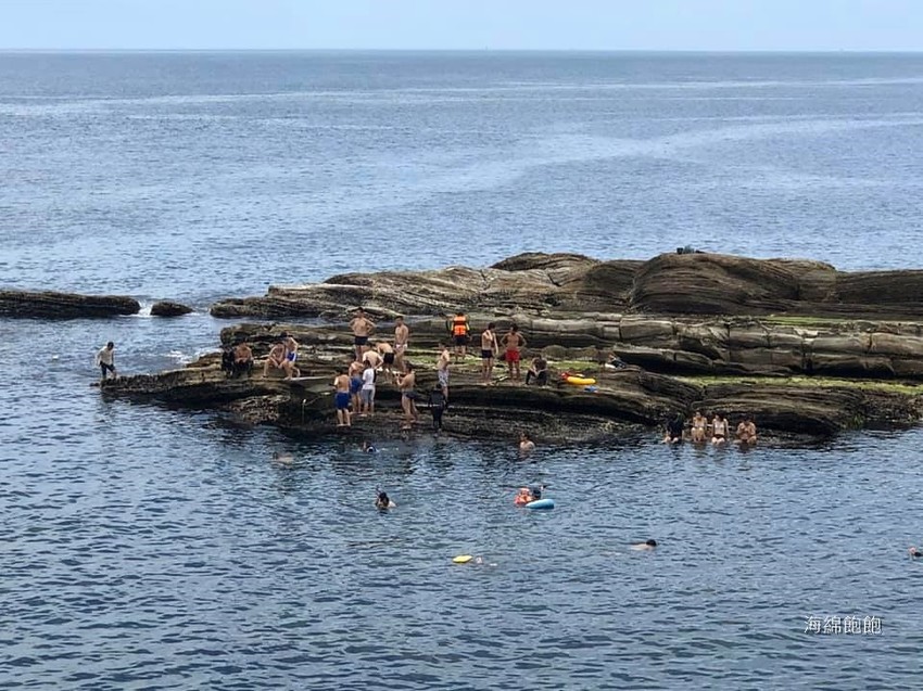 海中的礁石有好多人躺著曬日光浴,看起來超棒