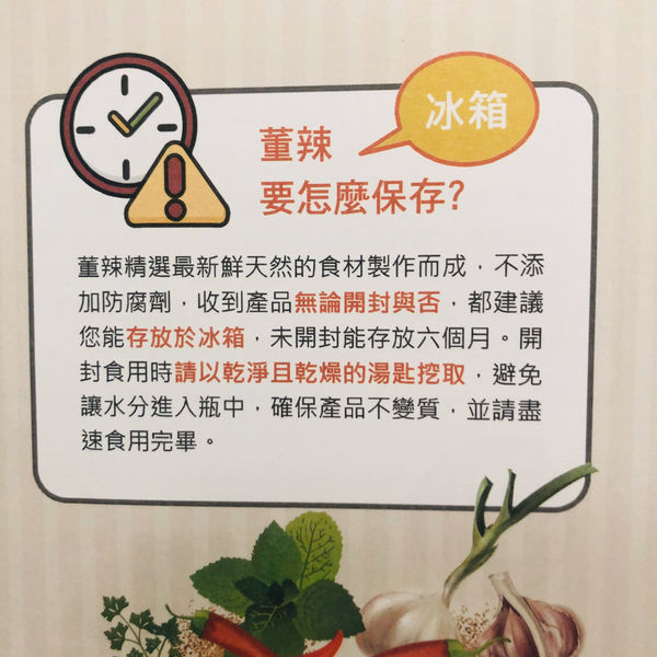 這是外觀的樣子,董辣是不加防腐劑的,不管有沒有開封都先丟冰箱冷藏保存,開封後最佳賞味期限為三個月。