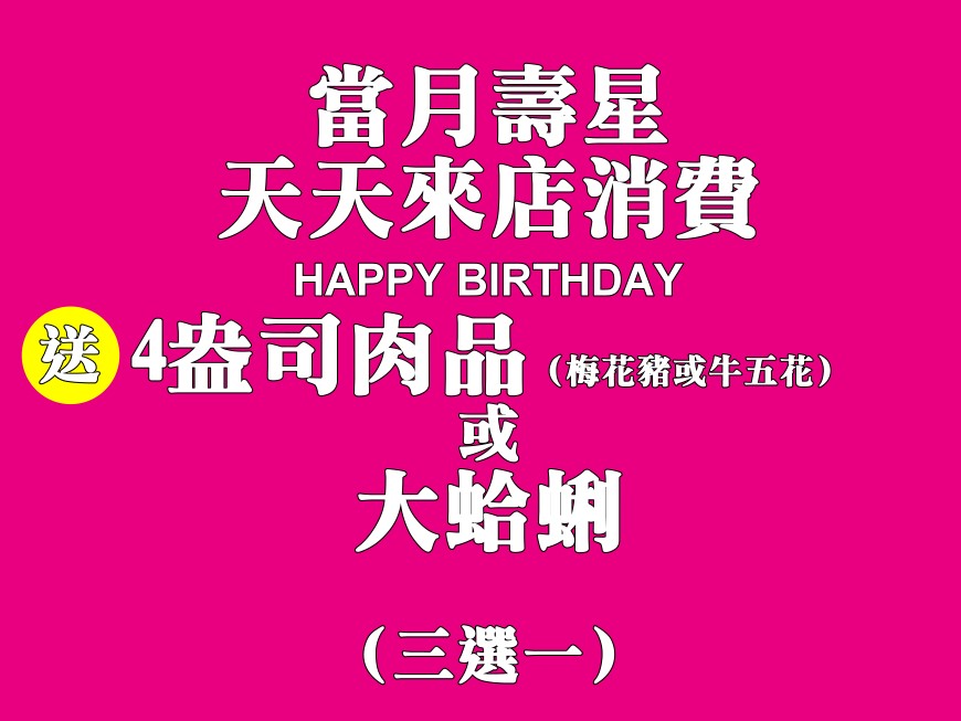當月壽星來店消費就送4盎司肉品(梅花豬或牛五花)或大蛤蜊一份(三選一)