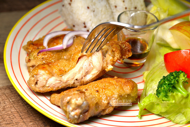 主角是去腿雞腿排,搭配混合了藜麥捏成的三角飯糰,還有生菜與水果佐以香香甜甜的油醋醬