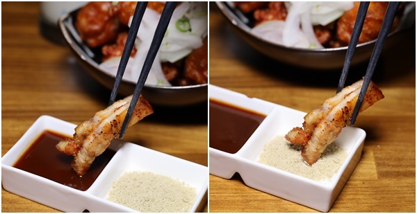 使用特調醬汁醃漬,讓五花肉吸附醬汁,燒烤後不需再加醬