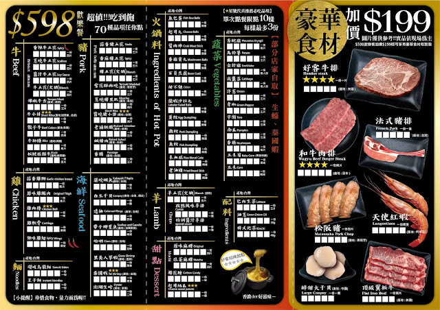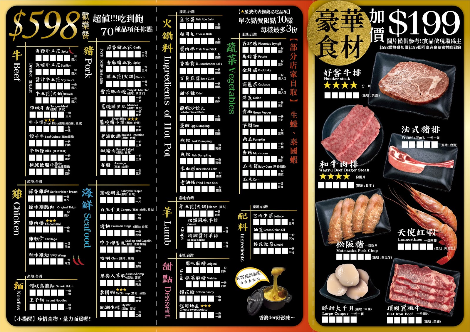 總共三種價位,最便宜的是598元吃到飽,如果是小鳥胃的,其實這價位就很夠吃了,另外則是598再加199,會再多七種高級食材吃到飽(包含日本和牛、松阪豬、天使紅蝦...等)。