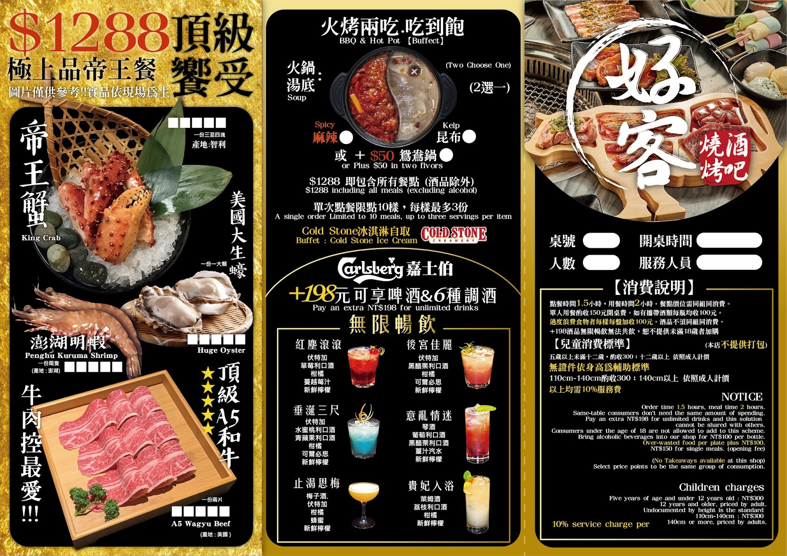 第三種價位就是1288頂級饗受,除了前面的餐點又多出了帝王蟹、頂級A5、澎湖明蝦...等。