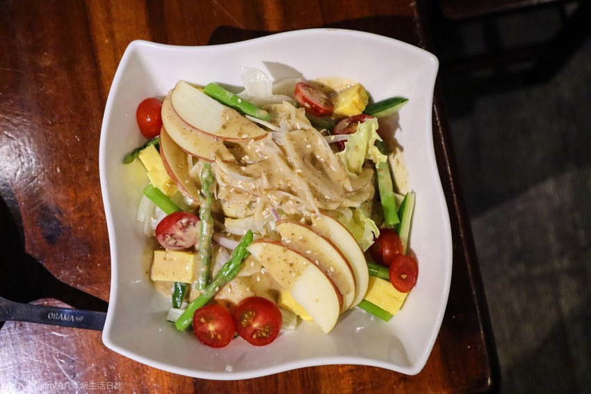 配菜相當豐富,蘋果、洋蔥、蘆筍、番茄、美生菜等,淋上份量十足的胡麻醬味道相當夠,另外還有小巧可愛的玉子燒口感滑嫩,2個人合吃一份,份量剛好,相當開胃。