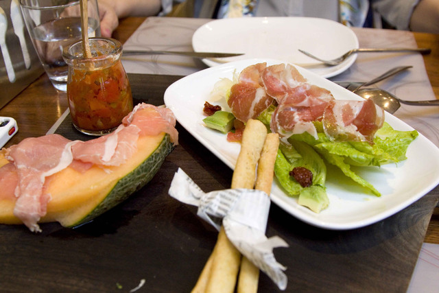 帕馬火腿搭配哈蜜瓜、手工麵包棒,