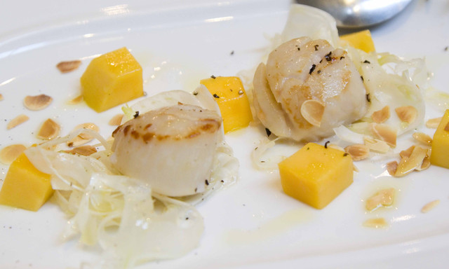 香煎北海道干貝,搭配芒果及烤杏仁 - 表現正常,不過看照片就可以知道干貝煎得不夠久,所以一樣有香氣帶不出來的問題。