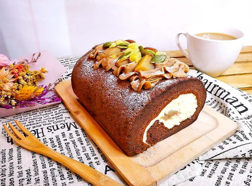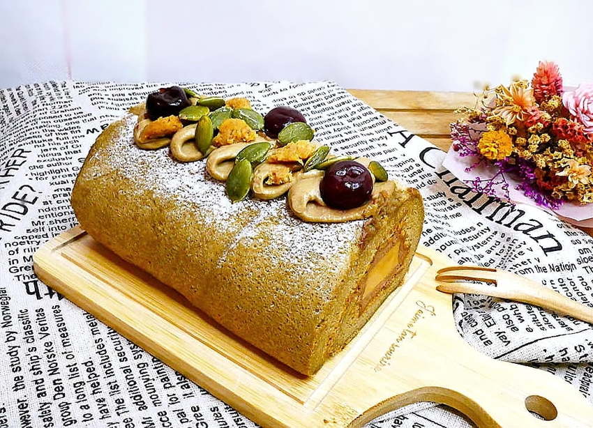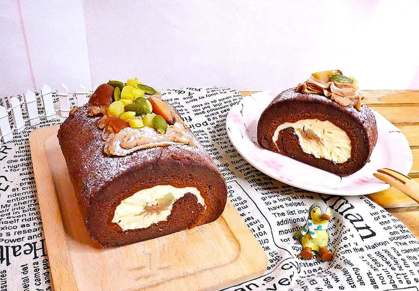 蛋糕捲上層以南瓜子/糖漬栗子丁及卡士達奶油裝飾.帶來視覺味覺雙饗宴