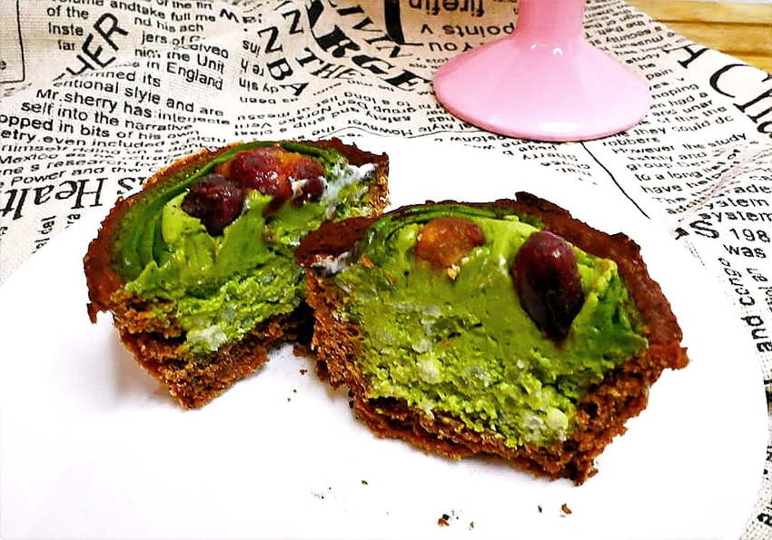 以日本靜岡抹茶粉及台梗9號白米飯熬製.塔上放銘珍紅豆粒做點綴, 看起來好可口