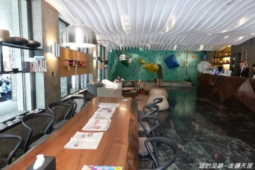 大廳的主視覺絕對就是後方的這一面攀岩牆了,色彩繽紛的攀岩牆僅有三公尺的安全高度
