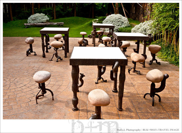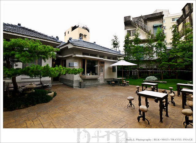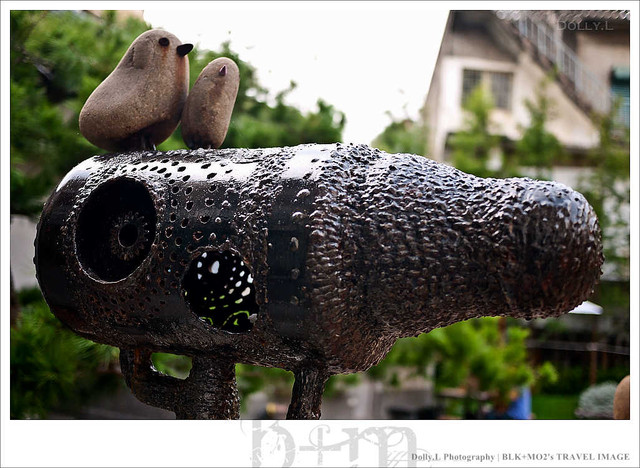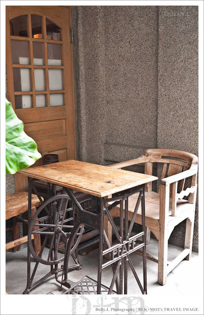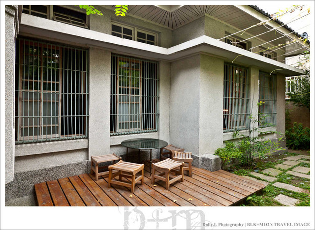前院空間還挺開闊的,舉辦一些藝文活動就是利用前院場地。庭院裡的創意桌椅與大門裝置藝術互相呼應著,而庭院圍籬是利用舊枕木築起,這裡充滿新舊混合的風味。