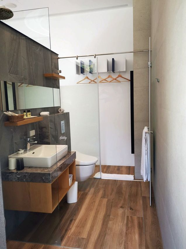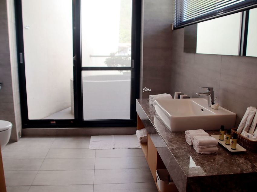 房門旁有一個mini bar及穿衣鏡,轉個彎就是衛浴及化粧室。淋浴間的窗外是綠意盎然的山林景色。