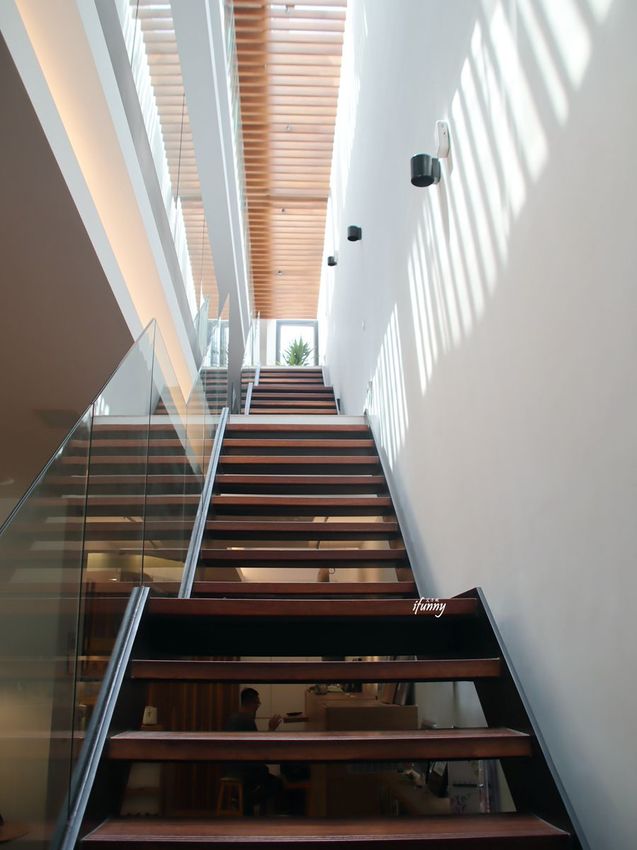 但終究肚子還是會餓,還是得起床吃早餐,此時被樓梯間的光影給美醒!這樓梯根本就是一個伸展台啊!