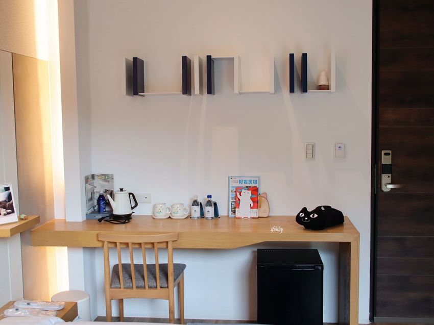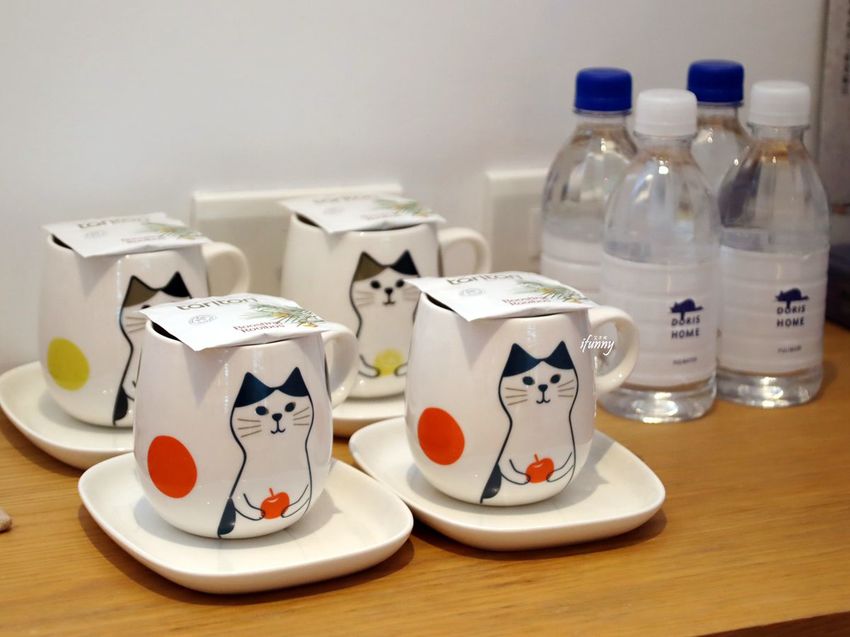 依人數配有可愛的貓咪馬克杯,礦泉水及燒水的快煮壺。