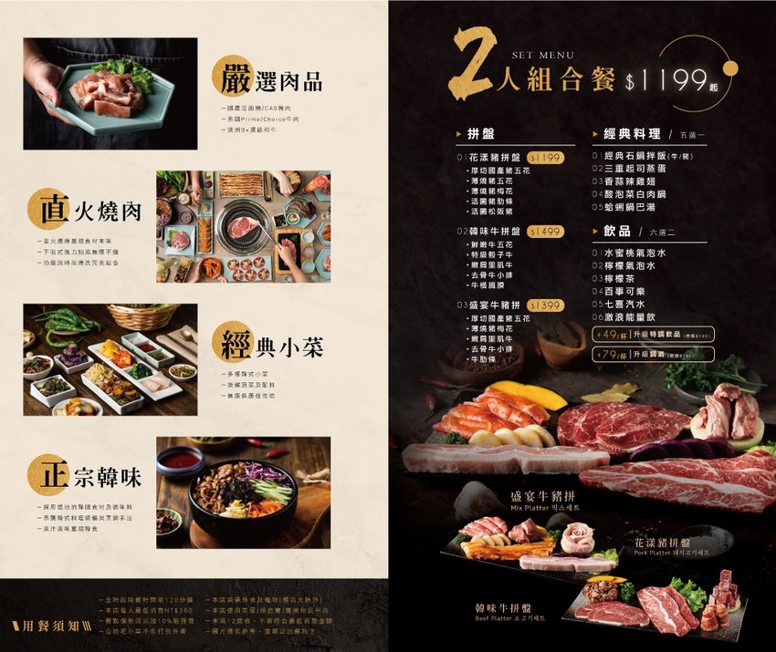 以單點套餐為主外,還有一些單點菜色,2人套餐1199元起,有全豬、全牛或半豬半牛的不同套餐~ 此外還有一些單點的海鮮或高級的肉品,就看個人喜好了!