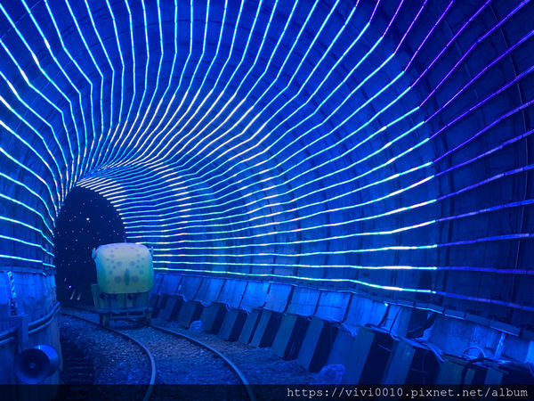 河豚自行車慢慢的在軌道上移動,剛好可欣賞兩旁的光雕燈光