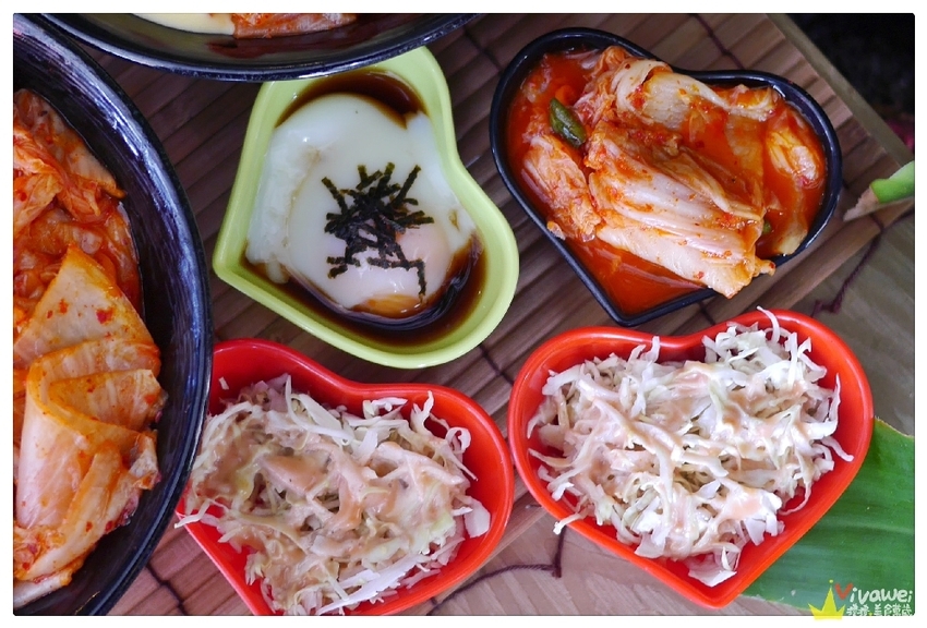 ▲「甜蜜月見溫泉蛋」和「韓式泡菜」是我們搭配套餐的新丼小食區,高麗菜沙拉則是隨餐附贈的。