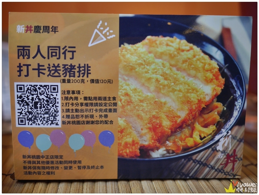 ▲「新丼桃園中正店」目前有周年慶活動,內用兩個人同行並點兩道主食,打卡分享設定公開,即可獲得重量200公克、價值120元的炸豬排一份(店家保有隨時修改、變更、暫停及終止本活動內容之權利)。