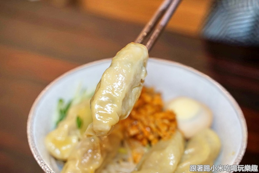 XO醬水餃拌麵(90元),水餃超大一顆,外表跟台式水餃不太一樣,外皮使用比較像雲吞的皮,形狀是比較長條形的。