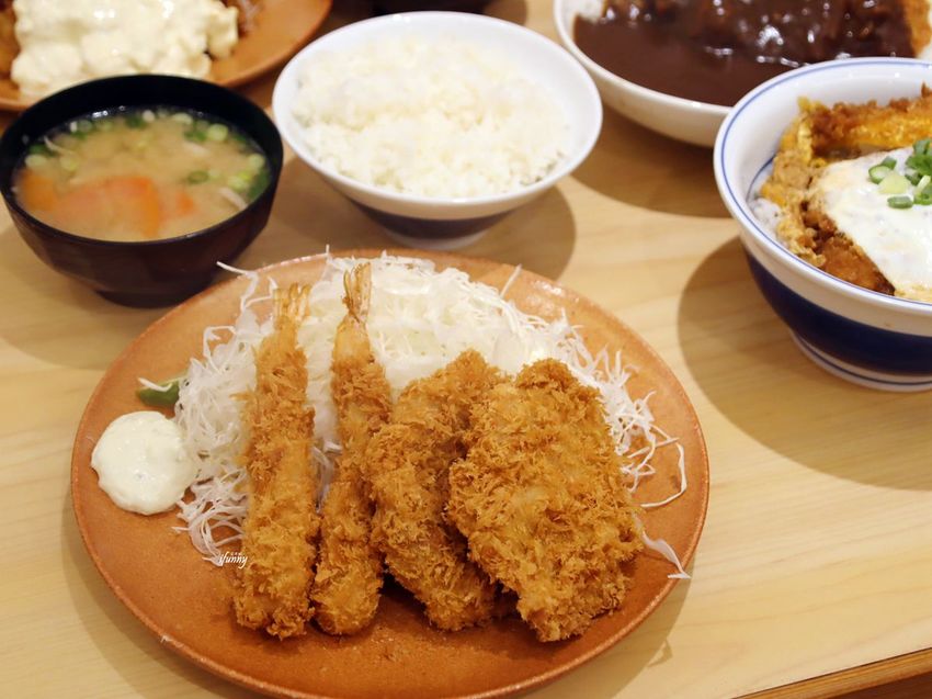 吃炸豬排通常還會有腰內肉的選項。腰內肉是所謂的小里肌,由於只有小小一條,所以切起來的肉片也都小小圓圓的一片,不會像里肌那麼大一片。這個腰內是豬身上最不會運動到的部位,因此很軟很嫩。而從外表來看這腰內炸得很乾爽,吃來真的比里肌肉還來得柔軟許多。至於炸蝦,友人說蝦肉與麵衣比例頗恰當,吃來不會只有麵衣的空虛感。