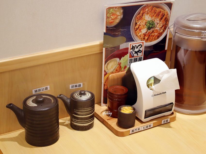 每張座位備了一桶麥茶、蔬果熬製成的酸甜豬排沾醬、胡麻醬、黃芥末、七味粉、牙籤及衛生紙,可說是相當地週全。