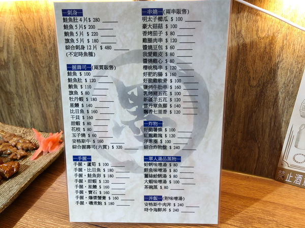 先奉上今天的菜單,串燒一次都是兩串一組,而且在凌晨消夜時段能吃到生魚片真的很感動。